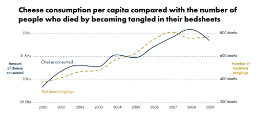 Data and statistics can provide valuable insights into people, places and businesses, but there are risks in interpreting data without applying appropriate scrutiny. It is important not to misunderstand the connection between two factors and misinterpret correlation as causation, highlighted by Professor Halliday using the below graph. According to these figures, it could be assumed that eating cheese is causing Americans to become tangled in bedsheets. While in reality, the figures are likely unrelated. The critical question to ask yourself is ‘does A cause B or is it just a spurious correlation?’